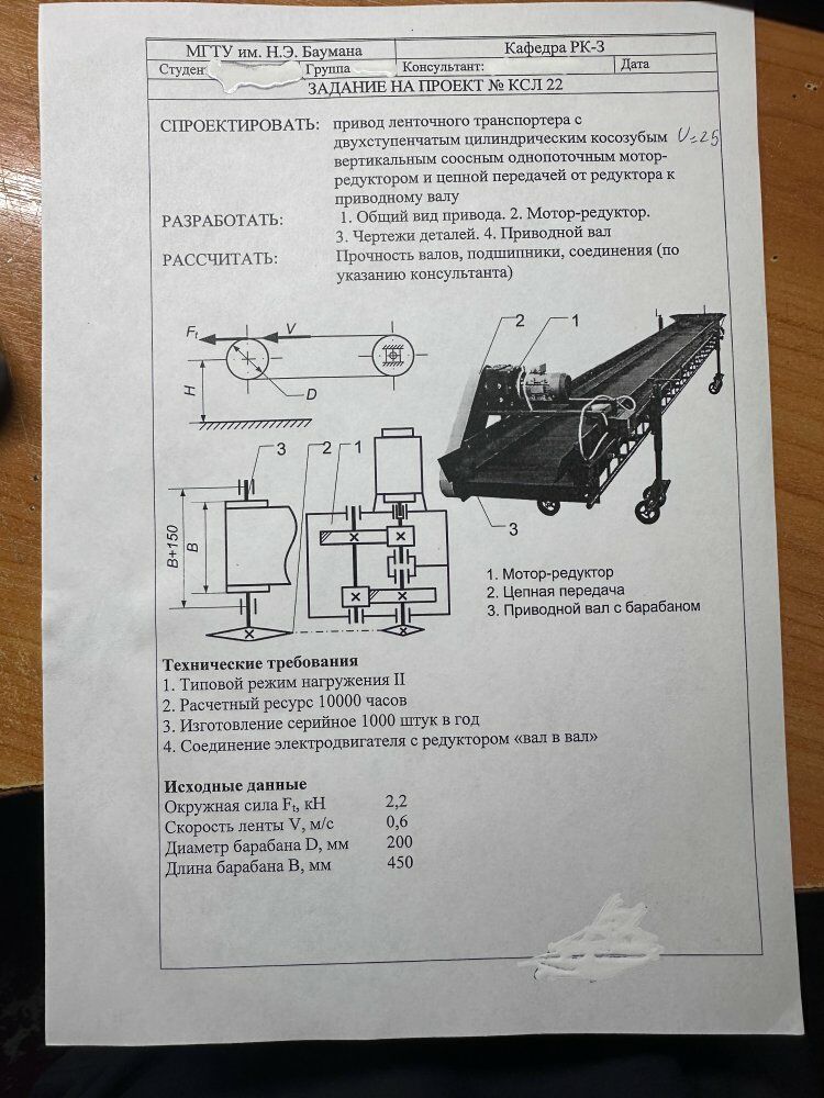 Для студентов МГТУ им. Н.Э.Баумана по предмету Детали машин (ДМ)Привод ленточного транспортера с двухступенчатым цилиндрическим косозубым вертикальным соосным однопоточным мотор-редуктором и цепной передачей от редПривод ленточного транспортера с двухступенчатым цилиндрическим косозубым вертикальным соосным однопоточным мотор-редуктором и цепной передачей от ред