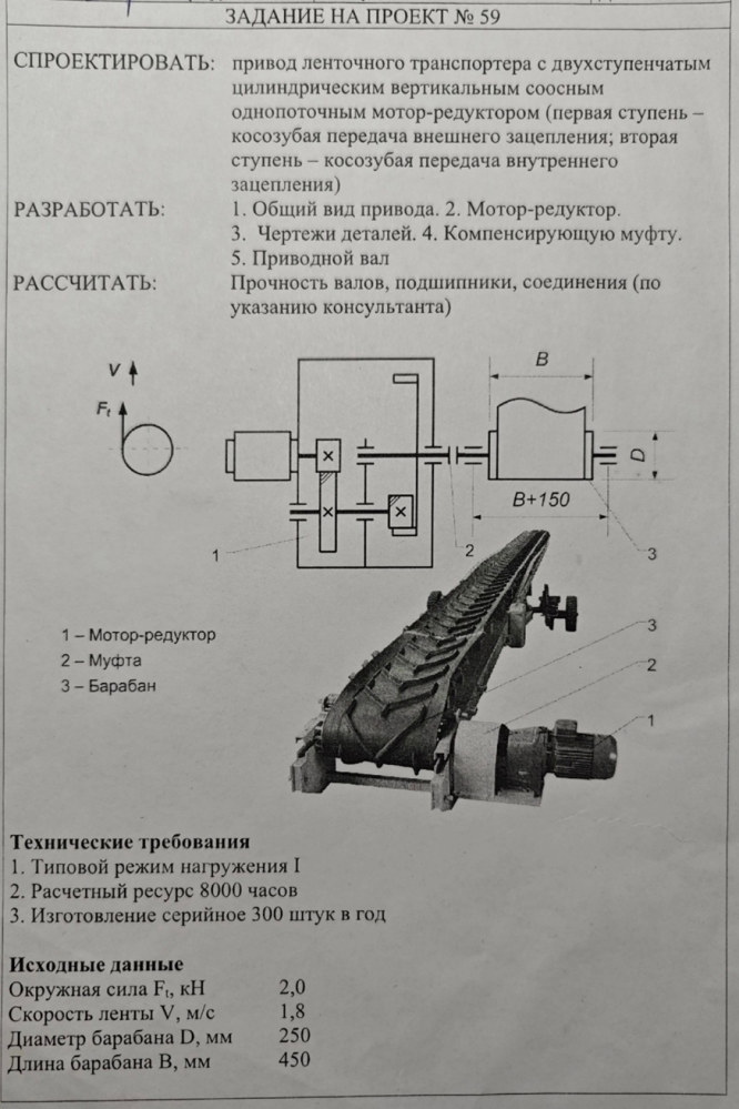 Для студентов МГТУ им. Н.Э.Баумана по предмету Детали машин (ДМ)Привод ленточного транспортера с двухступенчатым цилиндрическим вертикальным соосным однопоточным мотор-редукторомПривод ленточного транспортера с двухступенчатым цилиндрическим вертикальным соосным однопоточным мотор-редуктором