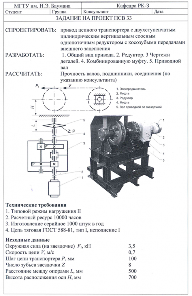 Для студентов МГТУ им. Н.Э.Баумана по предмету Детали машин (ДМ)Привод цепного транспортёра с двухступенчатым цилиндрическим вертикальным соосным однопоточным редуктором с косозубыми передачами внешнего зацепленияПривод цепного транспортёра с двухступенчатым цилиндрическим вертикальным соосным однопоточным редуктором с косозубыми передачами внешнего зацепления