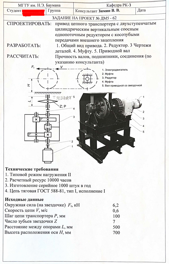 Для студентов МГТУ им. Н.Э.Баумана по предмету Детали машин (ДМ)Привод цепного транспортера с двухступенчатым цилиндрическим вертикальным соосным однопоточным редуктором с косозубыми передачами внешнего зацепленияПривод цепного транспортера с двухступенчатым цилиндрическим вертикальным соосным однопоточным редуктором с косозубыми передачами внешнего зацепления