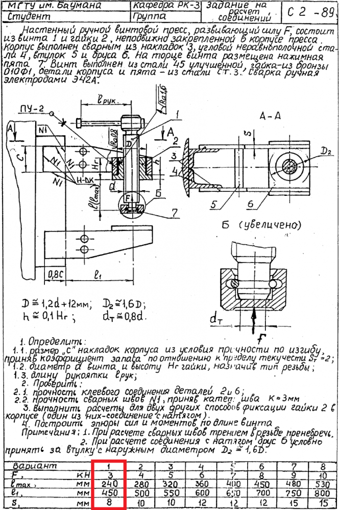 Настенный ручной винтовой пресс, развивающий силу F, состоит из винта 1 и гайки 2, неподвижно закрепленной в корпусе пресса..