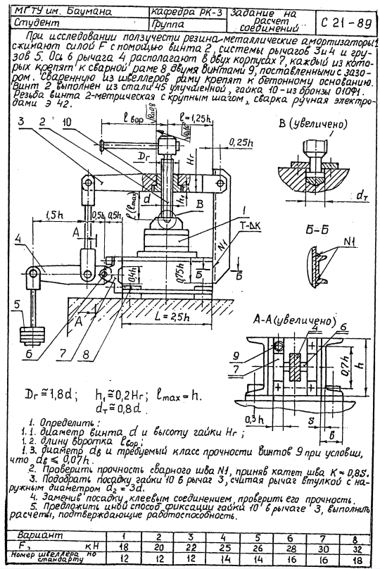 При исследовании ползучести резинометаллические ароматизаторы 1 сжимают силы F с помощью винта 2, система рычагов 3 и 4 и грузов 5. Ось 6 рычага 4, располагают в двух корпусах 7, каждый из которых крепят к сварной раме 8 двумя винтами 9, поставленными с зазором. Сваренную из швеллеров раму крепит бетонном основании. Винт 2 выполнен из стали 45 улучшенный, а гайка 10 – из бронзы О10Ф1. Резьба винта 2 – метрическая с крупным шагам, сварка ручная электродами Э42