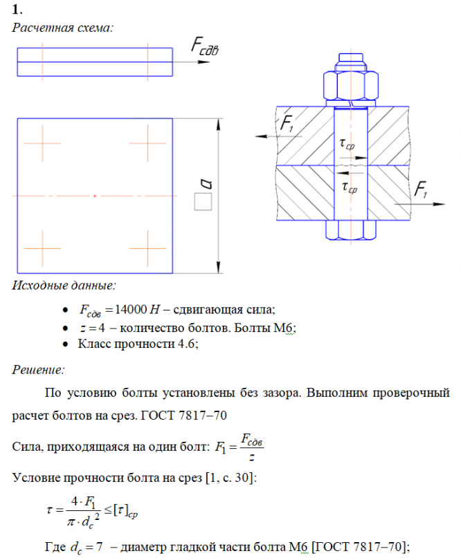 1. Сделать заключение о прочности группового резьбового соединения двух плит, состоящего из четырех болтов М6 класса прочности 4.6, установленных без зазора, нагруженного силой F=14 кН, действующей в плоскости стыка;