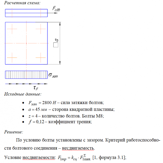 2. Две квадратных плиты с длиной стороны a=45 мм соединены четырьмя болтами М8, поставленными с зазором и затянутыми силой Fзат=2,8 кН, при этом работоспособность соединения при наличии сдвигающей силы гарантировано. Оценить возможность замены резьбового соединения клеевым с помощью клея ВК-9 с тем же коэффициентом безопасности. Коэффициент трения принять равным f=0,12.