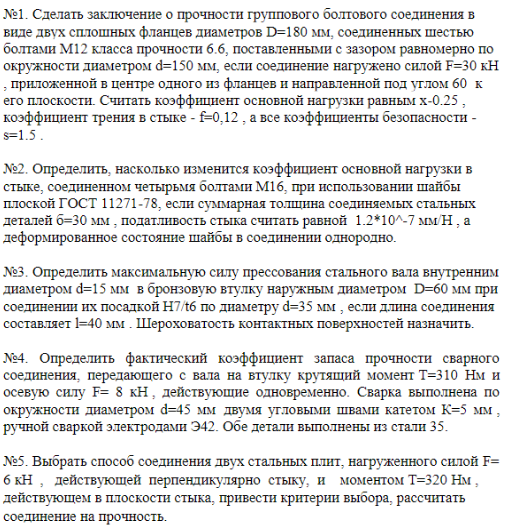№1. Сделать заключение о прочности группового болтового соединения в виде двух сплошных фланцев диаметров D=180 мм, соединенных шестью болтами М12 класса прочности 6.6, поставленными с зазором равномерно по окружности диаметром d=150 мм, если соединение нагружено силой F=30 кН , приложенной в центре одного из фланцев и направленной под углом 60 к его плоскости. Считать коэффициент основной нагрузки равным x-0.25 , коэффициент трения в стыке - f=0,12 , а все коэффициенты безопасности - s=1.5 . №2. Определить, насколько изменится коэффициент основной нагрузки в стыке, соединенном четырьмя болтами М16, при использовании шайбы плоской ГОСТ 11271-78, если суммарная толщина соединяемых стальных деталей б=30 мм , податливость стыка считать равной 1.2*10^-7 мм/Н , а деформированное состояние шайбы в соединении однородно.