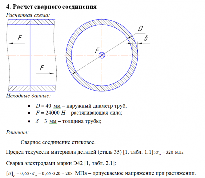 4. Сделать заключение о прочности сварного соединения стыковым швом двух круглых труб, изготовленных из стали 35, если сварка ручная электродами Э42А, внешний диаметр трубы составляет D=40 мм, а ее толщина d=3 мм, а соединение нагружено осевой растягивающей силой F=24 кН.