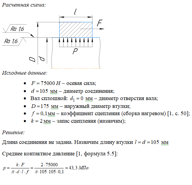 3. Спроектировать соединение с натягом сплошного вала диаметром d=105 мм из стали 40Х со втулкой с наружным диаметром D=175 мм из чугуна СЧ10, передающее осевую силу F=75 кН. Шероховатость поверхностей назначить, расчет проводить исходя из условия гарантированного натяга.