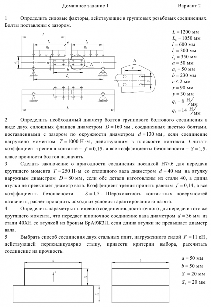 2 Определить необходимый диаметр болтов группового болтового соединения в виде двух сплошных фланцев диаметром D =160 мм , соединенных шестью болтами, поставленными с зазором по окружности диаметром d =130 мм , если соединение нагружено моментом T =1000 Н⋅м, действующим в плоскости контакта. Считать коэффициент трения в контакте – f = 0,15 , а все коэффициенты безопасности – S =1, 5 , класс прочности болтов назначить. 3 Сделать заключение о пригодности соединения посадкой H7/t6 для передачи крутящего момента T = 250 Н⋅м со сплошного вала диаметром d = 40 мм на втулку наружным диаметром D = 80 мм, если обе детали изготовлены из стали 40, а длина втулки не превышает диаметр вала.