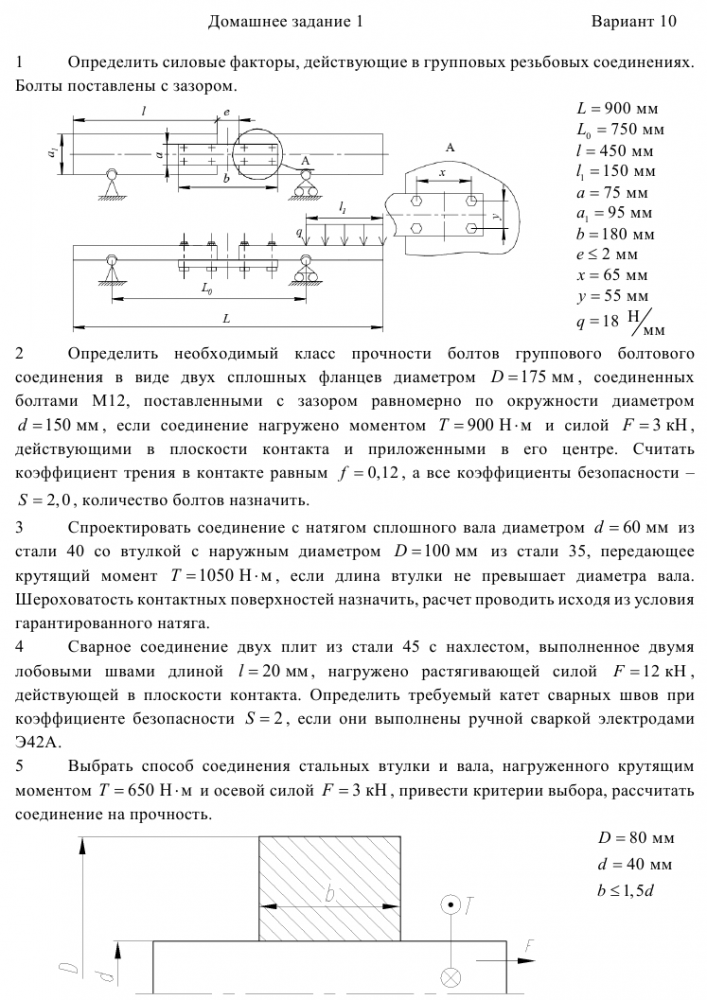 2 Определить необходимый класс прочности болтов группового болтового соединения в виде двух сплошных фланцев диаметром D =175 мм , соединенных болтами М12, поставленными с зазором равномерно по окружности диаметром =d1 50 мм, если соединение нагружено моментом T = 900 Н⋅м и силой F = 3 кН , действующими в плоскости контакта и приложенными в его центре. Считать коэффициент трения в контакте равным f = 0,12 , а все коэффициенты безопасности – =S2 ,0, количество болтов назначить. 3 Спроектировать соединение с натягом сплошного вала диаметром d = 60 мм из стали 40 со втулкой с наружным диаметром D =100 мм из стали 35, передающее крутящий момент T =1050 Н⋅м, если длина втулки не превышает диаметра вала.