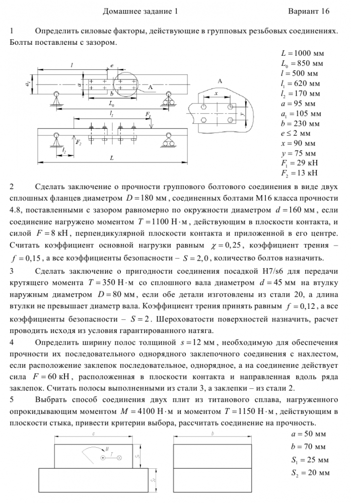 Считать полосы выполненными из стали 3, а заклепки – из стали 2. 5 Выбрать способ соединения двух плит из титанового сплава, нагруженного опрокидывающим моментом M = 4100 Н⋅м и моментом T =1150 Н⋅м, действующим в плоскости стыка, привести критерии выбора, рассчитать соединение на прочность. .