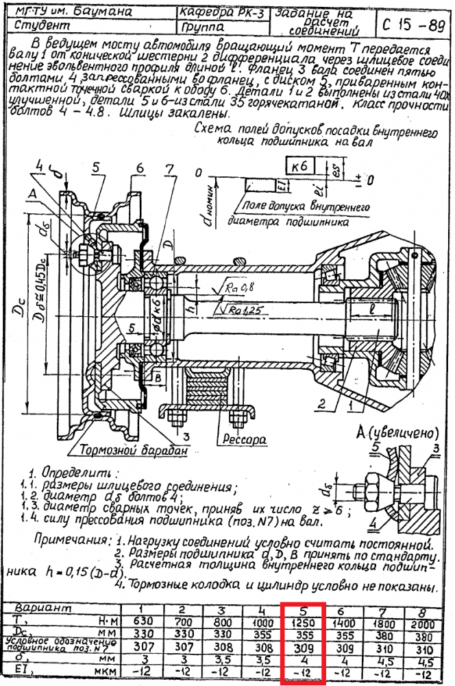 В ведущем мосту автомобиля вращающий момент Т передается валу 1 от конической шестерни 2 дифференциала через шлицевое соединение эвольвентного профиля длиной l. Фланец 3 вала соединен пятью болтами 4, запрессованными во фланец, с диском 5, приваренным контактной точечной сваркой к ободу 6. Детали 1 и 2 выполнены из стали 40Х улучшенной, детали 5 и 6 - из стали 35 горячекатаной. Класс прочности болтов 4 - 4.8. Шлицы закалены.
