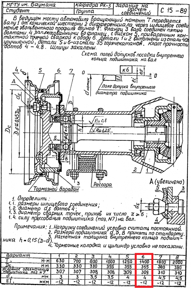 В ведущем мосту автомобиля вращающий момент Т передается валу 1 от конической шестерни 2 дифференциала через шлицевое соединение эвольвентного профиля длиной l. Фланец 3 вала соединен пятью болтами 4, запрессованными во фланец, с диском 5, приваренным контактной точечной сваркой к ободу 6. Детали 1 и 2 выполнены из стали 40Х улучшенной, детали 5 и 6 - из стали 35 горячекатаной. Класс прочности болтов 4 - 4.8. Шлицы закалены.