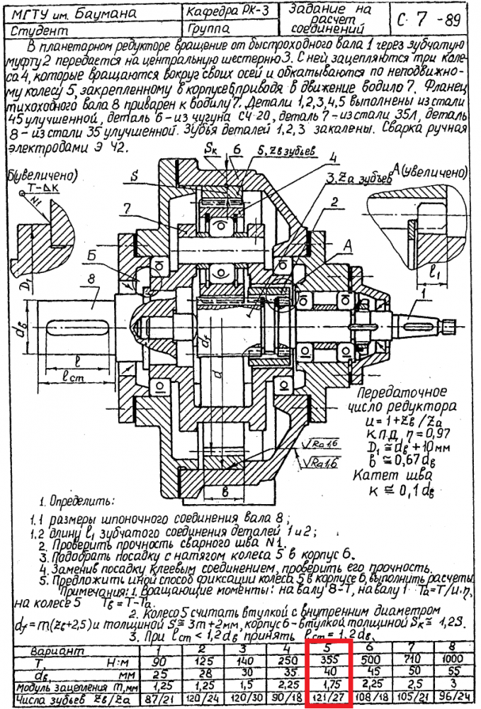 В планетарном редукторе вращение от быстроходного вала 1 через зубчатую муфту 2 передается на центральную шестерню 3. С ней зацепляются три колеса 4, которые вращаются вокруг своих осей и обкатываются по неподвижному колесу 5, закрепленному в корпусе 6, приводя в движение водило 7. Фланец тихоходного вала 8 приварен к водилу 7. Детали 1, 2, 3, 4, 5 выполнены из стали 45 улучшенной, деталь 6 - из чугуна СЧ 20, деталь 7 - из стали 35Л, деталь 8 - из стали 35 улучшенной. Зубья деталей 1, 2, 3 закалены. Сварка ручная электродами Э42..