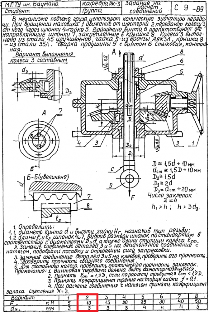 В механизме подъема груза используют коническую зубчатую передачу. При вращении маховика 1 движение от шестерни 2 передают колесу 3, от негочерез шпонку 4 - гайке 5. Вращению винта препятствуют две направляющие шпонки 7, закрепленные в крышке 8. Колесо 3 выполнено из стали 45 улучшенной, гайка 5 - из бронзы А9Ж3Л, крышка 8 - из стали 35Л. Сварка проушины 9 с винтом 6 стыковая контактная..