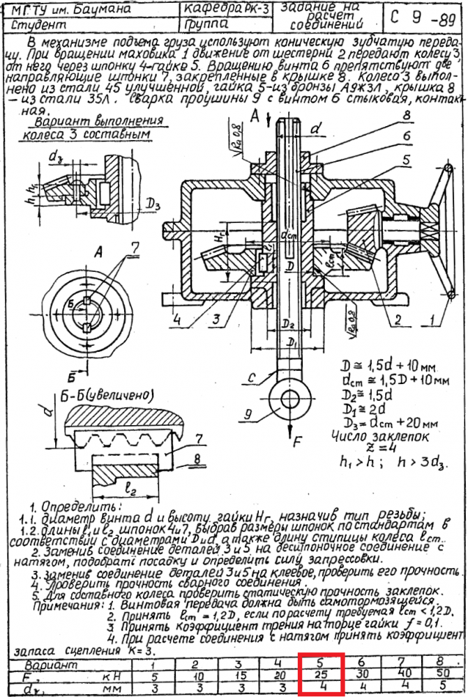 В механизме подъема груза используют коническую зубчатую передачу. При вращении маховика 1 движение от шестерни 2 передают колесу 3, от негочерез шпонку 4 - гайке 5. Вращению винта препятствуют две направляющие шпонки 7, закрепленные в крышке 8. Колесо 3 выполнено из стали 45 улучшенной, гайка 5 - из бронзы А9Ж3Л, крышка 8 - из стали 35Л. Сварка проушины 9 с винтом 6 стыковая контактная..