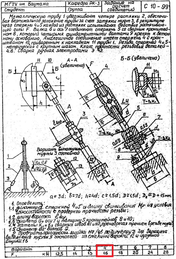 Металлическую трубу 1 удерживают четыре растяжки 2, обеспечивая вертикальное положение трубы за счет затяжки муфт 3, в результате чего стержни 4 и 5 каждой из растяжек испытывают действие растягивающей силы F. Вилка 6 и ось 7 соединяют стержень 5 со сварным кронштейном 8, который четырьмя фундаментными болтами 9 крепят к бетонному основанию. Аналогичное соединение имеет стержень 4 с кронштейном 10, приваренным к накладкам 11 трубы 1. Резьба стержней 4 и 5 - метрическая с крупным шагом. Класс прочности резьбовых деталей - 4.8. Сварка ручная электродами Э42..
