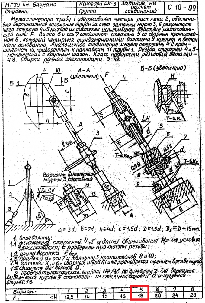 Металлическую трубу 1 удерживают четыре растяжки 2, обеспечивая вертикальное положение трубы за счет затяжки муфт 3, в результате чего стержни 4 и 5 каждой из растяжек испытывают действие растягивающей силы F. Вилка 6 и ось 7 соединяют стержень 5 со сварным кронштейном 8, который четырьмя фундаментными болтами 9 крепят к бетонному основанию. Аналогичное соединение имеет стержень 4 с кронштейном 10, приваренным к накладкам 11 трубы 1. Резьба стержней 4 и 5 - метрическая с крупным шагом. Класс прочности резьбовых деталей - 4.8. Сварка ручная электродами Э42..
