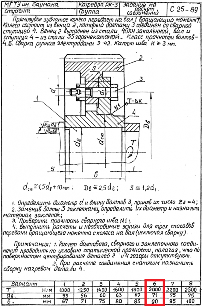 Прямозубое зубчатое колесо передает на вал 1 вращающий момент Т. Колесо состоит из венца 2, который болтами 3 соединен со сварной ступицей 4. Венец 2 выполнен из стали 40ХН закаленной, вал и ступица 4 - из стали 35 горячекатаной. Класс прочности болтов - 4.6. Сварка ручная электродами Э42. Катет шва 3 мм..