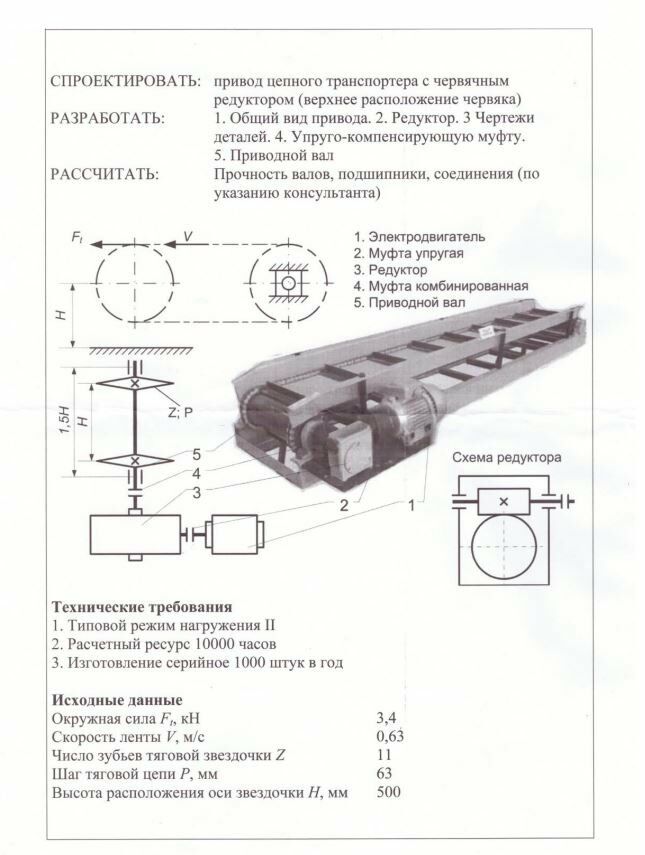 В рамках данного проекта, необходимо разработать привод цепного транспортера. Цепной транспортер предназначен для непрерывной горизонтальной транспортировки штучных грузов. Движение цепи осуществляется с помощью тяговых звездочек. Передача вращения на них осуществляется посредством червячного редуктора. Соединение приводного и тихоходного валов осуществляется посредством комбинированной упруго-предохранительной муфты. Приводная станция смонтирована на сварной раме транспортёра. Электропитание осуществляется от сети переменного 3-х фазного тока с частотой 50 Гц и напряжением 380В. Расчётный ресурс 10000 часов при надежности подшипников качения 90%, зубчатых передач 98%. Изготовление серийное – 1000 штук в год.