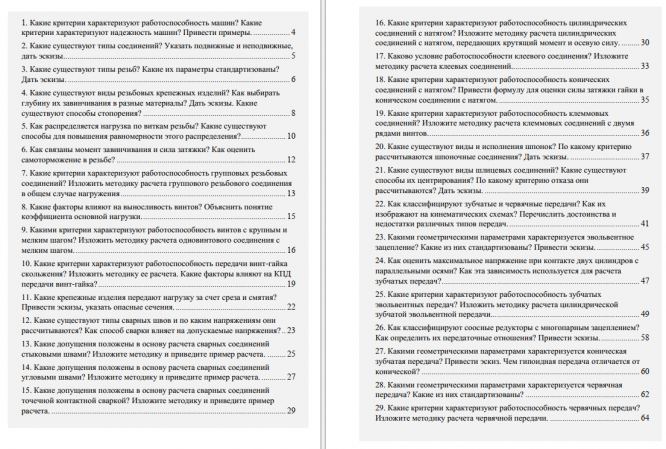 критерии характеризуют работоспособность машин, критерии характеризуют надежность машин, Какие существуют типы соединений, типы резьб, виды резьбовых крепежных изделий, выбирать глубину их завинчивания в разные материалы, способы стопорения, нагрузка по виткам резьбы, способы для повышения равномерности, связаны момент завинчивания и сила затяжки, самоторможение в резьбе, работоспособность групповых резьбовых соединений, расчета группового резьбового соединения, факторы влияют на выносливость винтов, коэффициента основной нагрузки, работоспособность винтов с крупным и мелким шагом, расчет одновинтового соединения с мелким шагом, работоспособность передачи винт гайка скольжения, факторы влияют на КПД передачи винт-гайка, крепежные изделия.