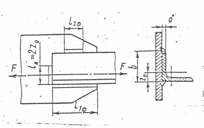 Рассчитать нахлёсточное сварное соединение равнополочного уголка с косынкой, нагруженное растягивающей силой F=200кН. Соединение должно быть равнопрочным цельной конструкции. Сварка ручная дуговая, электродом – Э42А. материал деталей – сталь Ст5.