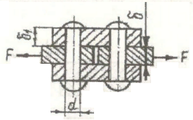 Определить необходимое количество заклепок n диаметром d=17 мм для соединения впритык двух листов при помощи двух накладок. Растягивающая сила F=300 кН, толщина листов δ=10 мм, толщина накладок δ1=6 мм. Допускаемое напряжение на срез [τ]ср=100 МПа, н
