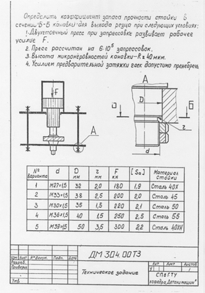 Задача № 304 по дисциплине «Детали машин и основы конструирования» Вариант №4 Определить коэффициент запаса прочности стойки в сечении Б-Б канавки для выхода резца при следующих условиях: 1. Двухстоечный пресс при запрессовке развивает рабочее усилие F 2. Пресс рассчитан на 600000 запрессовок 3. Высота микронеровностей канавки Rz40мкм 4. Усилием предварительной затяжки гаек допустимо пренебречь.