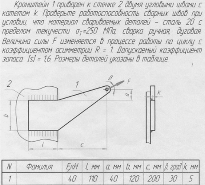 Дисциплина: Детали машин и основы конструирования Тема: Сварное соединение Вариант 322/1 Кронштейн 1 приварен к стенке 2 двумя угловыми швами с катетом k. Проверьте работоспособность сварных швов при условии, что материал свариваемых деталей - Сталь 20 с пределом текучести 250 МПа, сварка ручная, дуговая. Величина силы F изменяется в процессе работы по циклу с коэффициентом асимметрии R=1. Допускаемый коэффициент запаса =1,6. Размеры деталей указаны в таблице.