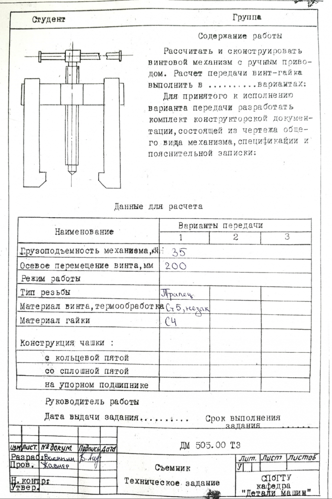 Расчетно-графическая работа № 1 по дисциплине Детали машин и основы конструирования Проектирование передачи винт-гайка Техническое задание Спроектировать передачу винт-гайка и выполнить её расчёт для распорного домкрата с ручным приводом. Разработать комплект конструкторской документации, состоящий из чертежа общего вида механизма, спецификации и пояснительной записки. .