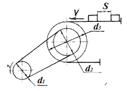 В привод транспортёра входит ременная передача, ведомый шкив которой вращается с частотой n2=160 об/мин через 4 секунды равнопеременного вращения из состояния покоя. Определить скорость перемещения ленты транспортёра V через 5 секунд от начала разгона. Определить также расстояние S, на которое переместится груз, находящийся на ленте за это же время, если известно: d2=200 мм, d3=300 мм.