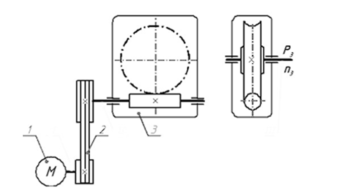 1 – двигатель; 2 – плоскоременная передача; 3 – червячная передача;