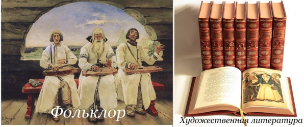 Фольклор и литература относятся к одному виду искусства — искусству слова. Оба предназначены для создания художественных словесных образов, воспринимаемых на слух. Мы преображаем их в своем сознании в картинки, действо.