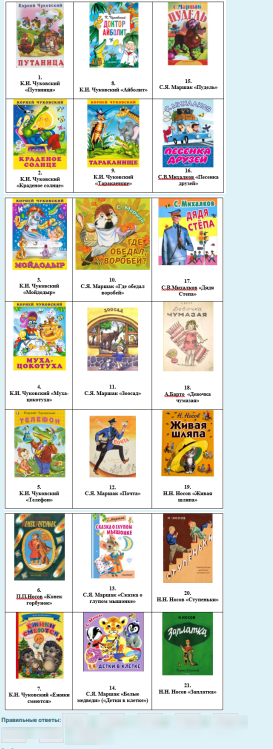 Задание 1. Ваша коллега оформила выставку для родителей детей младшего дошкольного возраста на тему «Что почитать детям?». Внимательно изучите выставку книг и определите, какие из предложенных произведений не рекомендованы для детей данного возраста. Выберите один или несколько правильных ответов Задание 2. Издавна существует множество фольклорных выражений и произведений, специально предназначенных для детей. Это играет огромную роль в воспитании подрастающего поколения. Прочитайте с выражением и определите, к какому малому фольклорному жанру относятся данные выражения, для этого впишите в таблицу цифру, которая соответствует изображению малого фольклорного жанра и ее выражению.