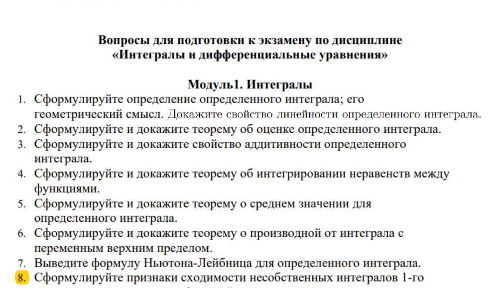 5. Сформулируйте и докажите теорему о среднем значении для определенного интегр ала. 6. Сформулируйте и докажите теорему о производной от интеграла с переменным верхним пределом . 7. Выведите формулу Ньютона-Лейбница для определенного интеграла. 8. Сформулируйте признаки сходимости несобственных интегралов 1-го рода для неотрицательных функций. 9. Сформулируйте и докажите предельный признак сходимости несобственных интегралов 1-го рода для неотрицательных функций. 1 О. Сформулируйте и докажите предельный признак сходимости несобственных интегралов 2-го рода для неотрицательных функций. 11. Сформулируйте признаки сходимости несобственных интегралов 2-го рода для неотрицательных функций.