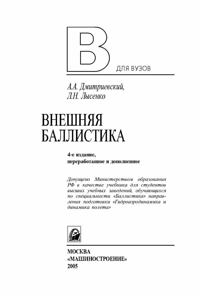 Для студентов МГТУ им. Н.Э.Баумана по предмету Динамика полётаДмитриевский А.А., Лысенко Л.Н. Внешняя баллистика 2005Дмитриевский А.А., Лысенко Л.Н. Внешняя баллистика 2005