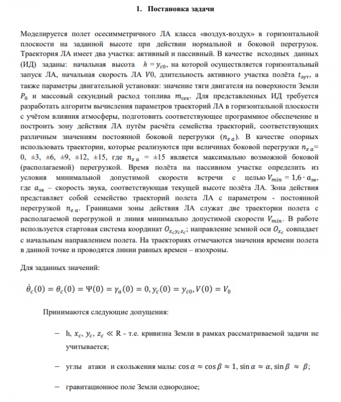 Моделируется полет осесимметричного ЛА класса «воздух-воздух» в горизонтальной плоскости на заданной высоте при действии нормальной и боковой перегрузок. Траектория ЛА имеет два участка: активный и пассивный. В качестве исходных данных (ИД) заданы: начальная высота ℎ =