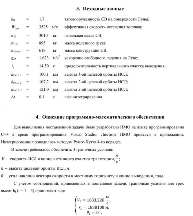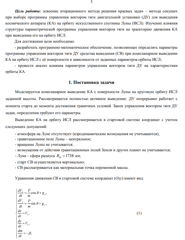 Цель работы: освоение итерационного метода решения краевых задач – метода секущих при выборе программы управления вектором тяги двигательной установки (ДУ) для выведения космического аппарата (КА) на орбиту искусственного спутника Луны (ИСЛ). Изучение влияния структуры параметрической программы управления вектором тяги на траекторию движения КА при выведении его на орбиту ИСЛ. Для достижения цели необходимо: - разработать программно-математическое обеспечение, позволяющее определять параметры программы управления вектором тяги ДУ средства выведения (СВ) при компланарном выведении КА на орбиту ИСЛ с еѐ поверхности в зависимости от заданных параметров орбиты ИСЛ; - провести анализ влияния параметров управления вектором тяги ДУ на характеристики орбиты КА.