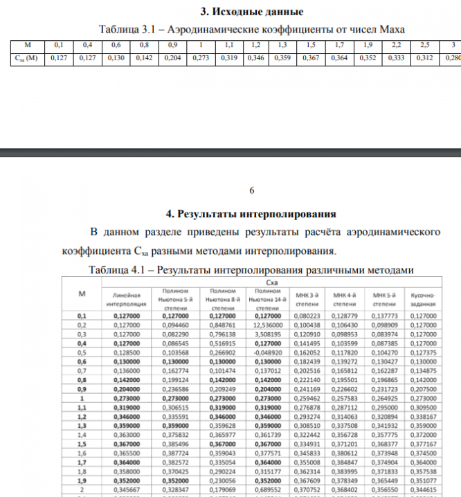 1. Постановка задачи Разработать алгоритмы и программы аппроксимации аэродинамического коэффициента Сха(М), заданного таблично. 1. Составить таблицу «заданных» значений аэродинамического коэффициента Сха(М)зад в диапазоне 0.1 ≤ М ≤ 3 с шагом 0.1. Значения Сха(М)зад между узловыми точками рассчитать методом линейной интерполяции. Построить график зависимости Сха(М)зад. 2. Определить коэффициенты интерполяционного полинома Ньютона для любых 6, 9 и 15-ти узловых точек и составить таблицы значений аэродинамического коэффициента Сха(М) в диапазоне 0.1 ≤ М ≤ 3 с шагом 0.1. Значения Сха(М) между узловыми точками рассчитать с помощью интерполяционного полинома Ньютона 5, 8 и 14-й степени. Построить графики зависимости Сха(М). 3. Определить коэффициенты аппроксимирующего полинома 3-го, 4-го и 5-го порядка, полученного методом наименьших квадратов для 15-ти узловых точек и составить таблицы значений аэродинамического коэффициента Сха(М) в диапазоне 0.1 ≤ М ≤ 3 с шагом 0.1. Значения Сха(М) рассчитать с помощью аппроксимирующего полинома 3-го, 4-го и 5-го порядка. Построить графики зависимости Сха(М).