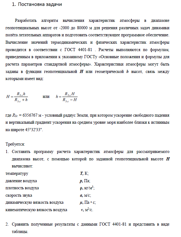 Стандарт: Самостоятельная работа №1 "Расчет характеристик стандартной атмосферы в соответствии с ГОСТ 4401-81" (вариант №20)