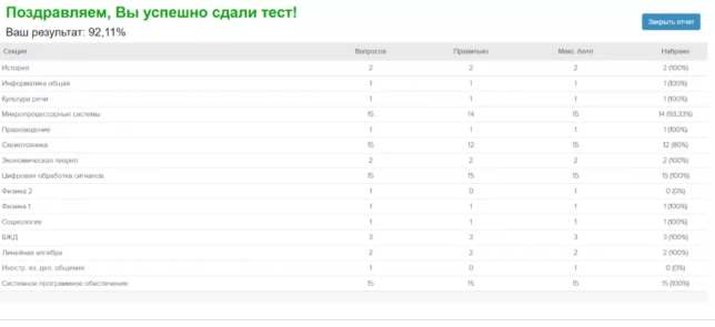 Ответы взяты из реальной базы данных. Тестирование было завершено с результатом более 87% в каждой попытке.