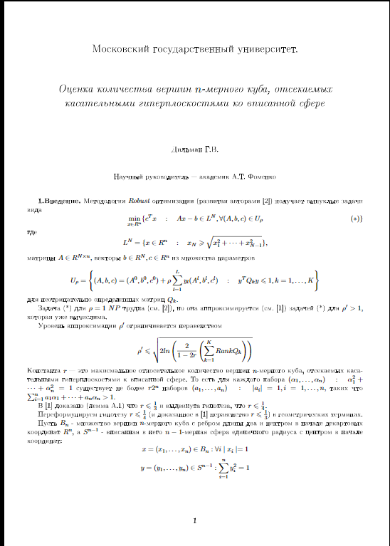 Для студентов МГУ им. Ломоносова по предмету Дипломы и ВКРОценка количества вершин n-мерного куба, отсекаемых касательными гиперплоскостями ко вписанной сфереОценка количества вершин n-мерного куба, отсекаемых касательными гиперплоскостями ко вписанной сфере