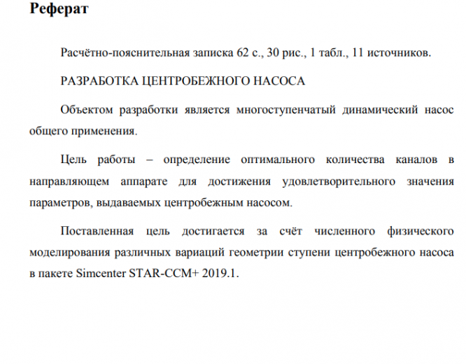 Расчётно-пояснительная записка 62 с., 30 рис., 1 табл., 11 источников. РАЗРАБОТКА ЦЕНТРОБЕЖНОГО НАСОСА Объектом разработки является многоступенчатый динамический насос общего применения. Цель работы – определение оптимального количества каналов в направляющем аппарате для достижения удовлетворительного значения параметров, выдаваемых центробежным насосом. Поставленная цель достигается за счёт численного физического моделирования различных вариаций геометрии ступени центробежного насоса в пакете Simcenter STAR-CCM+ 2019.1.