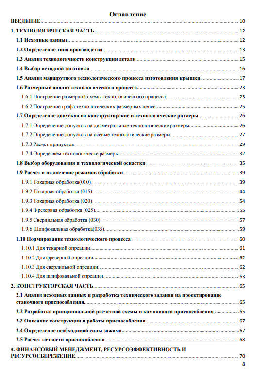Объектом исследования является деталь «Крышка». Цели и задачи исследования: создание эффективного маршрута технологического процесса изготовления детали «Крышка». Работа представлена введением, 4 разделами и заключением, список использованных источников. В 1 разделе «Технологическая часть» проектируется технология изготовления детали. В 2 разделе «Конструкторская часть» проектируется приспособление для закрепления детали. В 3 разделе «Финансовый менеджмент, ресурсоэффективность и ресурсосбережение» рассмотрен экономический анализ по оценке деловой привлекательности научной разработки. В 4 разделе «Социальная ответственность» рассмотрены вопросы, связанные с организацией рабочего места на механическом участке. В заключении приведены основные выводы.