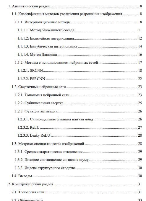 Целью работы является разработка и реализация метода, использующего сверточные нейронные сети, для увеличения разрешения изображений. Для достижения цели необходимо решить следующие задачи: ● проанализировать методы увеличения разрешения изображений; ● разработать архитектуру сверточной нейронной сети для увеличения разрешения изображения; ● разработать и представить структуру программного комплекса; ● реализовать и протестировать программный комплекс; ● провести экспериментальное сравнение разработанного метода и существующих аналогов.