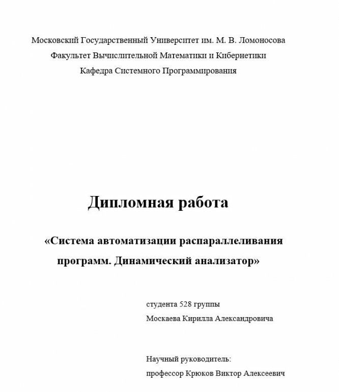 Главная » Учебные материалы » Дипломы и ВКР » Выпускные квалификационные работы (ВКР) » МГУ им. Ломоносова » 12 семестр (4 семестр магистратуры) » Система автоматизации распараллеливания программ. Динамический анализатор