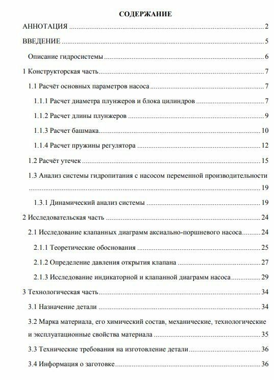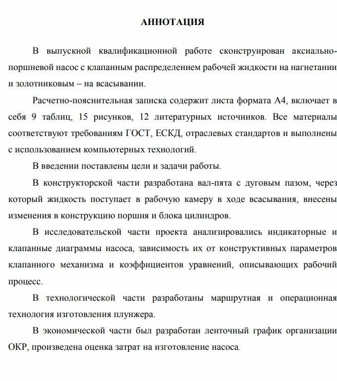 В выпускной квалификационной работе сконструирован аксиальнопоршневой насос с клапанным распределением рабочей жидкости на нагнетании и золотниковым – на всасывании. Расчетно-пояснительная записка содержит листа формата А4, включает в себя 9 таблиц, 15 рисунков, 12 литературных источников. Все материалы соответствуют требованиям ГОСТ, ЕСКД, отраслевых стандартов и выполнены с использованием компьютерных технологий. В введении поставлены цели и задачи работы. В конструкторской части разработана вал-пята с дуговым пазом, через который жидкость поступает в рабочую камеру в ходе всасывания, внесены изменения в конструкцию поршня и блока цилиндров. В исследовательской части проекта анализировались индикаторные и клапанные диаграммы насоса, зависимость их от конструктивных параметров клапанного механизма и коэффициентов уравнений, описывающих рабочий процесс. В технологической части разработаны маршрутная и операционная технология изготовления плунжера. В экономической части был разработан ленточный график организации ОКР, произведена оценка затрат на изготовление насоса.