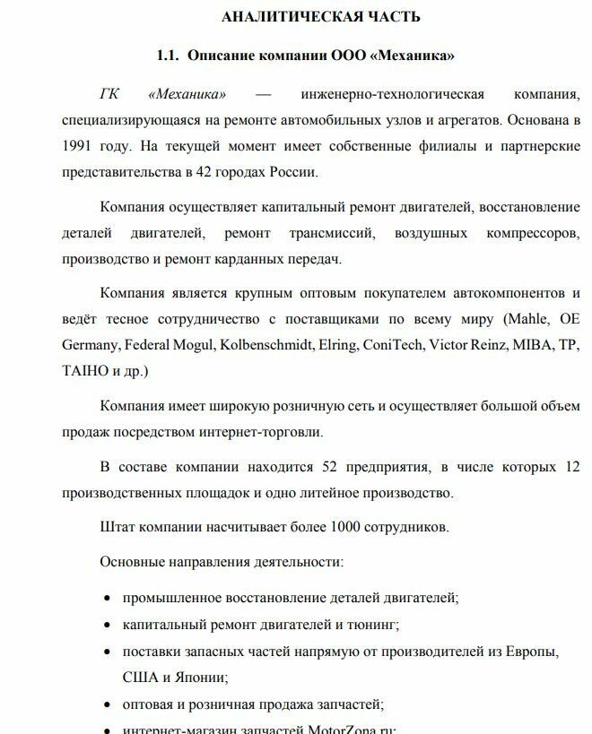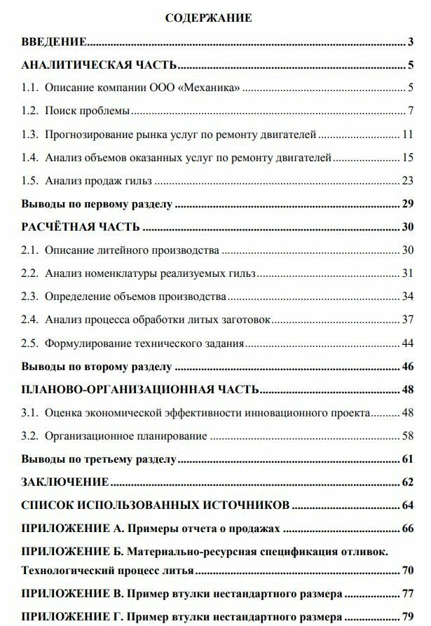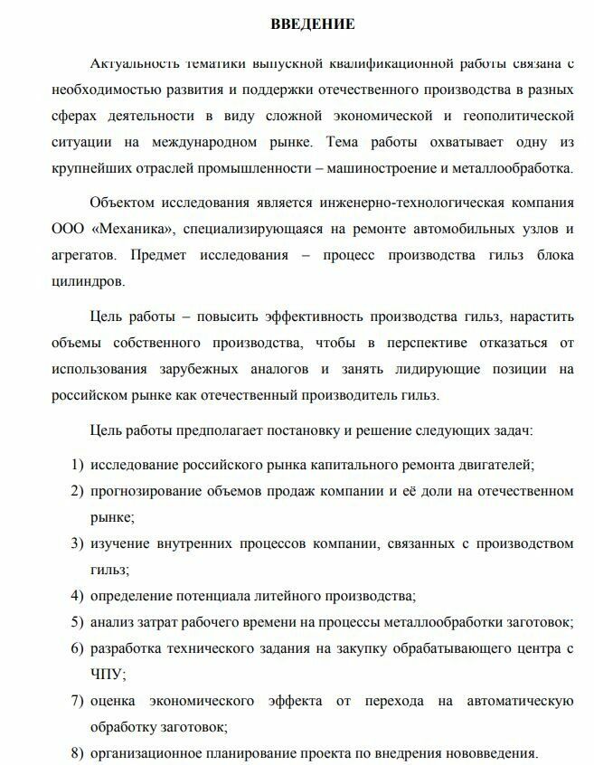 Актуальность тематики выпускной квалификационной работы связана с необходимостью развития и поддержки отечественного производства в разных сферах деятельности в виду сложной экономической и геополитической ситуации на международном рынке. Тема работы охватывает одну из крупнейших отраслей промышленности – машиностроение и металлообработка. Объектом исследования является инженерно-технологическая компания ООО «Механика», специализирующаяся на ремонте автомобильных узлов и агрегатов. Предмет исследования – процесс производства гильз блока цилиндров. Цель работы – повысить эффективность производства гильз, нарастить объемы собственного производства, чтобы в перспективе отказаться от использования зарубежных аналогов и занять лидирующие позиции на российском рынке как отечественный производитель гильз. Цель работы предполагает постановку и решение следующих задач: 1) исследование российского рынка капитального ремонта двигателей; 2) прогнозирование объемов продаж компании и её доли на отечественном рынке; 3) изучение внутренних процессов компании, связанных с производством гильз; 4) определение потенциала литейного производства; 5) анализ затрат рабочего времени на процессы металлообработки заготовок; 6) разработка технического задания на закупку обрабатывающего центра с ЧПУ; 7) оценка экономического эффекта от перехода на автоматическую обработку заготовок; 8) организационное планирование проекта по внедрения нововведения.