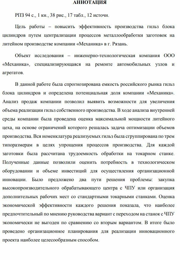 РПЗ 94 с., 1 кн., 38 рис., 17 табл., 12 источн. Цель работы – повысить эффективность производства гильз блока цилиндров путем централизации процессов металлообработки заготовок на литейном производстве компании «Механика» в г. Рязань. Объект исследования – инженерно-технологическая компания ООО «Механика», специализирующаяся на ремонте автомобильных узлов и агрегатов. В данной работе была спрогнозирована емкость российского рынка гильз блока цилиндров и определена потенциальная доля компании «Механика». Анализ продаж компании позволил выявить возможности для увеличения объема реализации гильз собственного производства. В ходе анализа внутренней среды компании была проведена оценка максимальной мощности литейного цеха, на основе ограничений которого решалась задача оптимизации объемов производства. Вся номенклатура реализуемых гильз была сгруппирована по трем типоразмерам в целях упрощения процессов производства. Для каждой заготовки была рассчитана трудоемкость обработки на токарном станке. Полученные данные позволили оценить потребность в технологическом оборудовании и объеме инвестиций для осуществления организационной инновации. Было предложено два пути решения проблемы: закупка высокопроизводительного обрабатывающего центра с ЧПУ или организация дополнительных рабочих мест со стандартными токарными станками. Оценка экономической эффективности каждого решения показала, что наиболее предпочтительный по мнению руководства вариант с переходом на станок с ЧПУ экономически не выгоден по сравнению со вторым вариантом. В итоге было проведено организационное планирования для реализации инновационного проекта наиболее целесообразным способом.