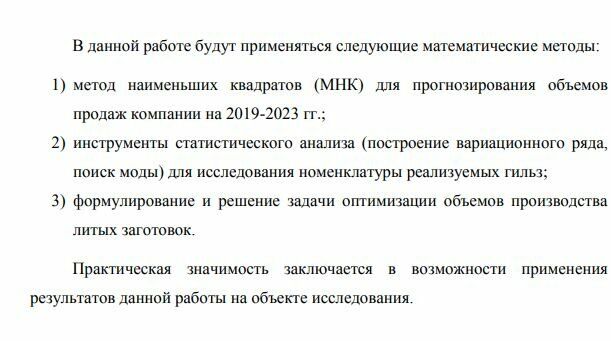 В данной работе будут применяться следующие математические методы: 1) метод наименьших квадратов (МНК) для прогнозирования объемов продаж компании на 2019-2023 гг.; 2) инструменты статистического анализа (построение вариационного ряда, поиск моды) для исследования номенклатуры реализуемых гильз; 3) формулирование и решение задачи оптимизации объемов производства литых заготовок. Практическая значимость заключается в возможности применения результатов данной работы на объекте исследования.