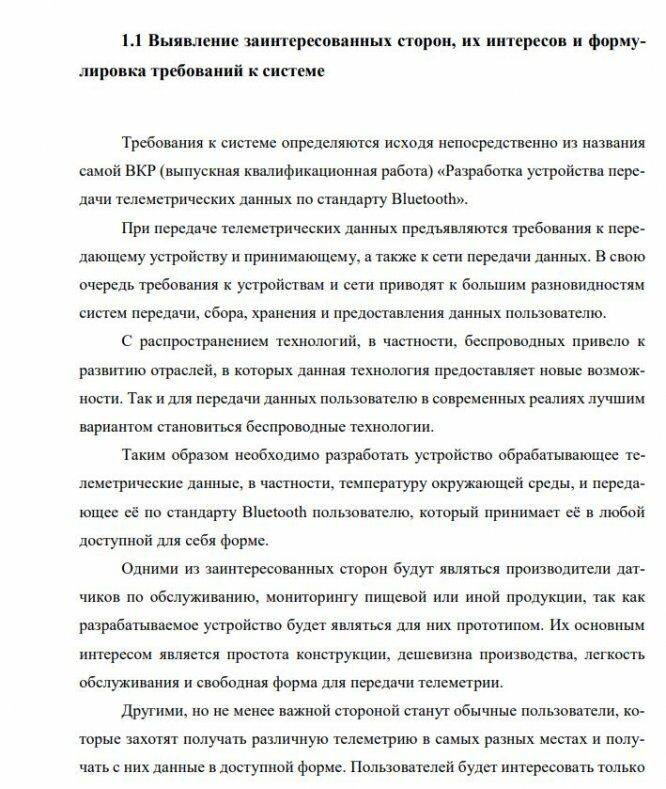 1.1 Выявление заинтересованных сторон, их интересов и формулировка требований к системе Требования к системе определяются исходя непосредственно из названия самой ВКР (выпускная квалификационная работа) «Разработка устройства передачи телеметрических данных по стандарту Bluetooth». При передаче телеметрических данных предъявляются требования к передающему устройству и принимающему, а также к сети передачи данных. В свою очередь требования к устройствам и сети приводят к большим разновидностям систем передачи, сбора, хранения и предоставления данных пользователю. С распространением технологий, в частности, беспроводных привело к развитию отраслей, в которых данная технология предоставляет новые возможности. Так и для передачи данных пользователю в современных реалиях лучшим вариантом становиться беспроводные технологии. Таким образом необходимо разработать устройство обрабатывающее телеметрические данные, в частности, температуру окружающей среды, и передающее её по стандарту Bluetooth пользователю, который принимает её в любой доступной для себя форме. Одними из заинтересованных сторон будут являться производители датчиков по обслуживанию, мониторингу пищевой или иной продукции, так как разрабатываемое устройство будет являться для них прототипом. Их основным интересом является простота конструкции, дешевизна производства, легкость обслуживания и свободная форма для передачи телеметрии. Другими, но не менее важной стороной станут обычные пользователи, которые захотят получать различную телеметрию в самых разных местах и получать с них данные в доступной форме. Пользователей будет интересовать только стоимость устройства, срок периода, которое устройство сможет проработать без обслуживания и простота получения данных. Третей сторон могут выступит злоумышленники, однако проблема в том, что данные телеметрии, которые они смогут выявить, не будет иметь для них какой-либо ценности, так как требования к защите хоть и не поднималось, и не описывалось, оно всё равно присутствует и решается за счёт использования соответствующей технологией по передаче данных.